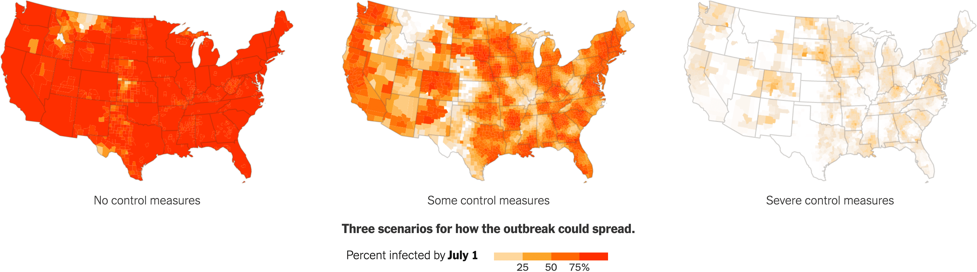 The article does say that the “No control measures” scenario is unlikely, since people and governments are already at least doing something, but here’s how it describes #2 and #3: “A second scenario envisions what would happen with some control measures, such as partial adherance to social distancing guidlines and a patchwork of government-imposed restrictions on work, travel, and dining out. A third envisions severe control measures: strict adherance across the country to social distancing, working remotely, closing schools and restaurants and banning large gatherings.”